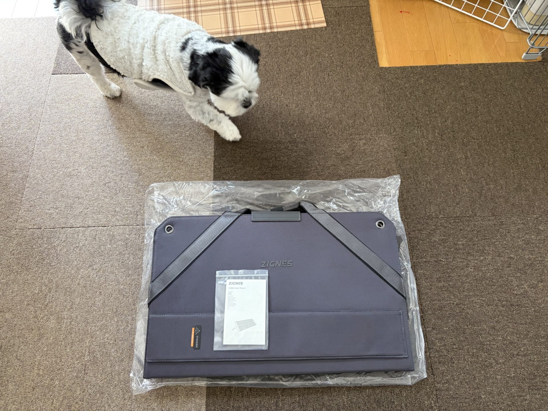 「それなら太陽の力に頼ってみよう!」ということで、今回は120ワットのソーラーパネルと専用アダプターを購入しました。
